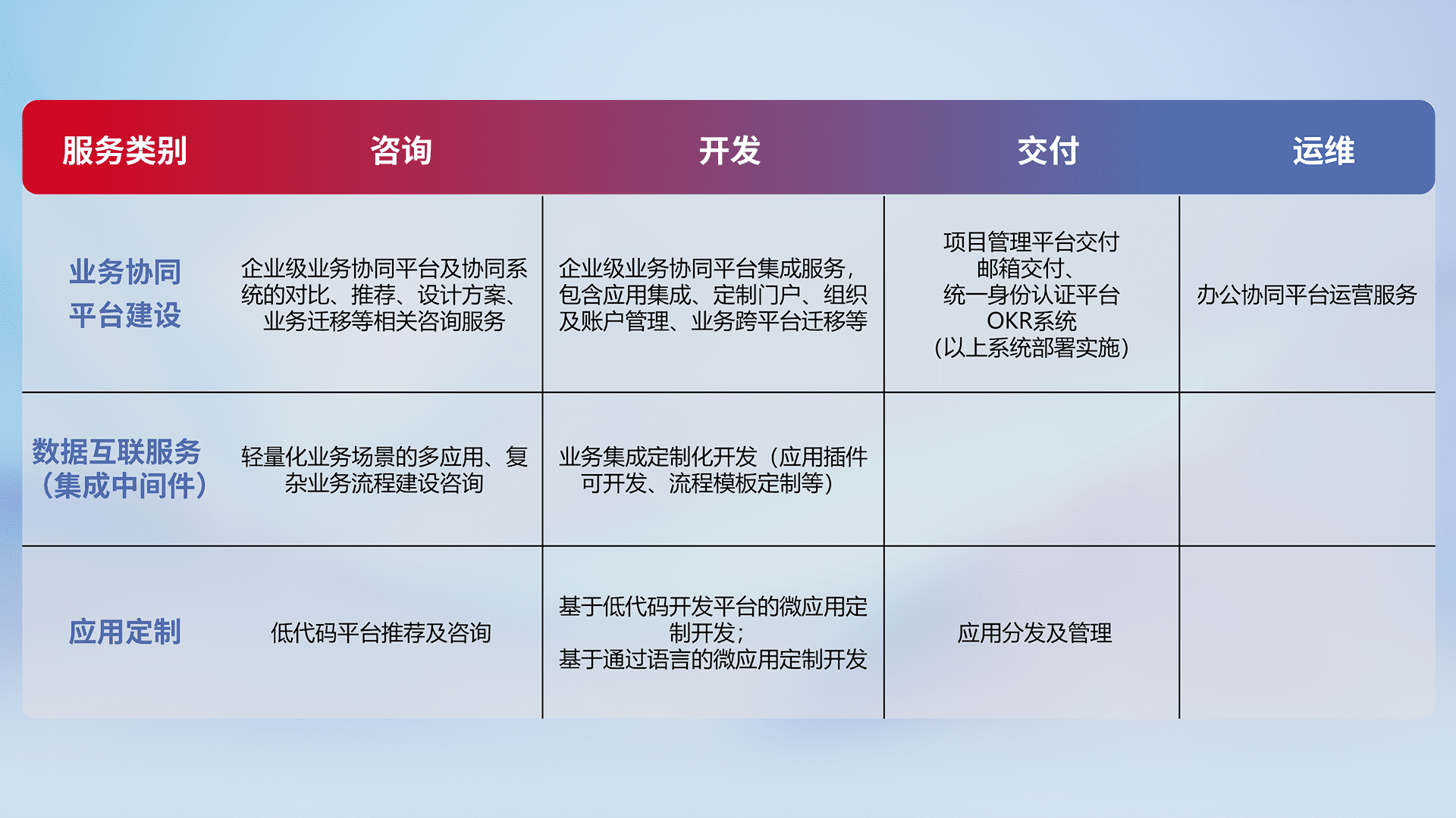 针对钉钉、、、、企微、、、、IDaas等平台级产品提供产品的规划、、、方案、、交付、、、定制化开发等服务,,实现如统一协同办公、、、智能客户服务、、、混合会议管理、、、智能数据查询、、、等业务场景,,,实现数字化转型。。。。